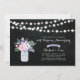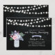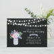Una elegante invitación de aniversario de bodas rústica con un jarrón de mason y un ramo de flores con fondo de pizarra.