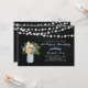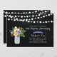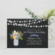 Una elegante invitación de aniversario de bodas rústica con un jarrón de mason y un ramo de flores sobre un fondo de pizarra.