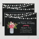 Una elegante invitación de aniversario de bodas rústica con un jarrón de mason y un ramo de flores con fondo de pizarra.
