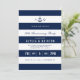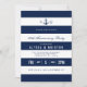 Una invitación de aniversario de tema náutico moderna y audaz que presenta un espacio para los monogramas de la novia y el novio y la información relevante relacionada con su evento dentro de franjas horizontales.