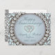 Una invitación de aniversario con monograma en forma de corazón verde turquesa. Hay diamantes en forma de corazón y puedes agregar iniciales dentro de los corazones de diamante plateados en el centro. El anillo de adorno de diamantes alrededor del mensaje "Feliz Aniversario" representa el círculo interminable de amor. Nota: La tarjeta es una impresión gráfica y no contiene diamantes ni purpurina. ¡Que tengas un evento MARAVILLOSO!