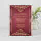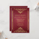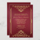 Esta invitación formal de celebración de aniversario de boda cuenta con imágenes de arte de la era victoriana doradas en la parte superior e inferior, y un borde dorado victoriano a juego en los lados. El texto personalizable también está en dorado, y todo está colocado sobre un elegante fondo rojo bruñido.