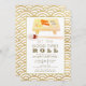 Esta elegante y moderna invitación de fiesta de Nochevieja "Que rueden los buenos tiempos" presenta sushi pintado con acuarela en tabla de madera con palillos enmarcados por un fondo blanco con patrones de ondas en dorado falso. El reverso presenta patrones de ondas en dorado falso. Cambie el color de fondo en la parte delantera y trasera y personalícela según sus necesidades.