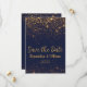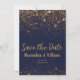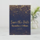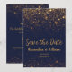 Tarjeta de anuncio de boda moderna, con letra cursiva, azul marino y dorado, perfecta para su boda bajo las estrellas. Asegúrese de que todos guarden la fecha y estén informados con su código QR personalizado para compartir eventos importantes y fotos. Parte de la Colección de Boda Bajo las Estrellas diseñada por LeAnn's Craft Room.