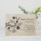 Anuncio de fecha de bodas de Lovebirds Floral dulce y caprichoso con una cascada de flores en una vid espiral y una pareja de lovebirds grises con un aspecto vintage con fondo de arte digital texturizado en beige. Esta encantadora invitación de fecha de bodas es perfecta para anunciar su boda de primavera o verano. Fácil de personalizar, simplemente agregue los detalles de su boda. Haga clic en "Personalizar" para encontrar más opciones de personalización.