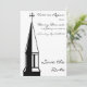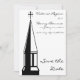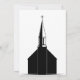 Una invitación de boda con una ilustración gráfica en blanco y negro de la aguja y la cruz de una iglesia. El reverso presenta una iglesia simplificada.