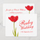 Hermosa invitación con un solo tulipán rojo en flor blanca para el 40º aniversario de bodas. Edite esta invitación con sus propias palabras y detalles de la boda de rubí. Invitación de arte fina de estilo campestre romántico simple. Diseño y pintura original de acuarela de Sarah Trett.