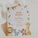 Invitación divertida a una ducha de bebé con acuarela adorables animales de la jungla. Personalice su información o haga clic en "Haga clic en el personalizar más adelante" para editar estilos de fuente, tamaño y colores.
