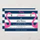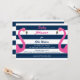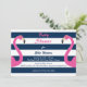 Los flamencos rosas y divertidos acentúan esta invitación Baby Shower a la moda en un fondo marino a rayas y blanco, lo que le da un toque náutico.