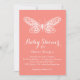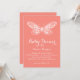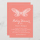 Guión de lazo brillante y acento de mariposa dibujado a mano en este coral, invitación a la ducha de bebé.
