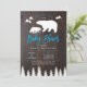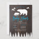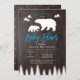 Esta invitación de Baby Shower presenta una temática de Mama Bear y Baby Bear con un estilo rústico. El diseño es elegante y de diseño, con las siluetas de una madre oso y su cachorro sobre un fondo de madera oscura. Montañas, pinos y un detalle de flecha añaden un toque forestal y exterior a esta invitación.