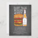 Las modernas y divertidas hamburguesas de pizarra y las parejas de barbacoa invitan a la ducha de bebé con una botella de cerveza con una enorme hamburguesa colocada sobre un fondo negro de pizarra y un traje a juego de damas rojas para darle un toque especial.