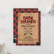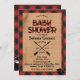 Este diseño cuenta con un fondo rojo de manta de búfalo y de malva con bonitos animales del bosque y un divertido guión. Fácil de personalizar con la información de su ducha de bebé.