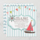 Helm y Sailboat Rayas Náuticas Baby Shower Banner Invitation Ilustracion de un velero, casco, ancla y un banner fiesta sobre rayas azules y blancas. Divertida y única invitación a la ducha de bebé.