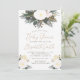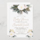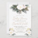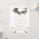 Ayudemos a celebrar a la encantadora futura madre con esta hermosa invitación a la ducha de bebé de invierno con flores blancas de color agua de siempre verde.