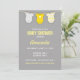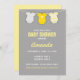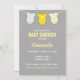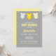 Invitación a la Baby Shower en tonos amarillos y grises, con un ilustracion de trajes de bebé en un tendedero. Este diseño es perfecto para una celebración de Baby Shower de Revelación de Género o Neutral.