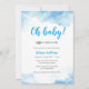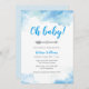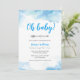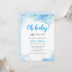 invitación de Baby Shower con título escrito a mano y acuarelas azules bonitas y una flecha decorativa.