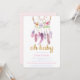 Esta adorable invitación boho-chic de cazador de sueños es perfecta para el baby shower que estás planeando. El diseño cuenta con flores y plumas pastel suaves y el texto resalta con los colores azul/gris y rosa delicados y perfectamente combinados.