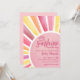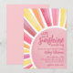 ¡Un pequeño rayo de sol está en camino! Celebre la próxima llegada con esta dulce y alegre invitación para baby shower con tema de sol. Un gran sol llena el diseño, con un suave centro rosa pastel y rayos rosados coordinados para un aspecto cálido y radiante. El texto del evento está centrado dentro del sol en hermosas fuentes rosadas, combinando estilos modernos y clásicos para un aspecto suave y equilibrado.