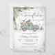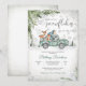 Celebra la llegada de tu pequeño con esta encantadora invitación de baby shower de bosque invernal. Con un camión verde vintage que lleva animales del bosque, globos y un árbol de Navidad, el diseño está acentuado con ramas de pino, copos de nieve y un fondo de bosque nevado. Perfecta para baby showers de invierno, esta tarjeta festiva y caprichosa combina el encanto rústico con la elegancia de la temporada. Los invitados amarán el tema acogedor del bosque y los deliciosos detalles que hacen que esta invitación sea verdaderamente memorable.