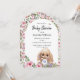 Tarjeta de invitación a la ducha de bebé de planta baja con adorables rosas de acuarela y un lindo conejito relleno.