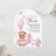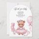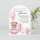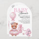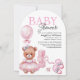 Una invitación a la ducha para bebés con un adorable ilustracion acuático de un oso de peluche vestido con un bonito vestido rosa.