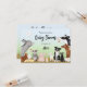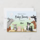¡Abajo en la granja todos los animales están súper emocionados de dar la bienvenida a un nuevo bebé! Esta linda invitación personalizada de baby shower cuenta con un burro, un ganso, una gallina y sus pollitos, un cabrito, un cerdito, un conejo, dos corderos, un border collie, un gato negro y una vaca con su ternero.