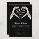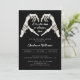Invitación de Baby Shower de Black Gothic Love Halloween. Minimalista invitación a la ducha de bebé con temática de Halloween con esqueleto de la mano de acuarela pintado a mano en forma de corazón, guión de caligrafía y diseño simple y limpio. Fondo negro delante y detrás. Puede personalizar la redacción, el estilo de letra, el color y el tamaño delante y detrás de la invitación.