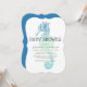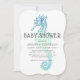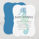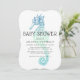 Invitación de baby shower de caballito de mar con tono azul-verdoso. La parte trasera de la invitación tiene un tono azul completo sólido. Se utiliza tipografía moderna. Envíame un mensaje si necesitas ayuda o tienes alguna solicitud especial.