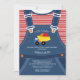 Es una invitación de A Boy Baby Shower que presenta el par más lindo de overoles para bebés con un camión de juguetes amarillo y azul. Única ducha para bebés.