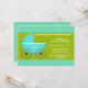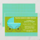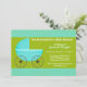 Rodadero azul con ruedas marrones sobre fondo verde con los bordes de polka de jade.