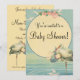 Una invitación fácil de personalizar para un niño con una ducha de bebé. Haga clic en el botón "personalizar" para acceder a todas las herramientas de diseño y cambiar el color de fondo o el tipo de letra. Niños de ilustracion y bebés de época con una cigüeña con un bebé recién nacido en una manta azul.