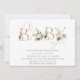 Invitación simple pero linda para baby shower de niña con una palabra en fuente serif y también texto de caligrafía dorada moderna falsa. La palabra baby está decorada con hermosas flores rosadas y blancas en follaje de safari o jungla. Esta invitación de baby shower de niña es ideal para un baby shower temático de safari floral para niñas.