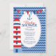 Moderna invitación náutica con un faro rojo y azul con un ancla y un lienzo inclinado sobre un fondo de rayas azules. Invitamos a nuestros navegantes a ver la parte de atrás para un toque especial. Perfecto para una ducha de natación con temática náutica para un chica, un niño o una ducha neutra de género.