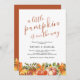 Invitaciones rústicas para una ducha de bebé de otoño con un fondo blanco simple, elegantes hojas y calabazas de acuarela, y una moderna plantilla de "un poco de calabaza está en camino" que es fácil de personalizar.