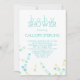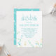 Invitación a la ducha de bebé con texto turquesa y pines de seguridad en verde, amarillo y turquesa.