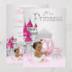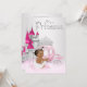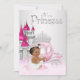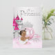 Invitaciones de baby shower de princesa afroamericana con adorable bebé princesa afroamericana y elegante carruaje de princesa sobre un hermoso fondo de castillo rosa. Esta hermosa invitación de baby shower de princesa en rosa y plata se personaliza fácilmente para su evento simplemente agregando sus detalles en el estilo de letra y redacción de su elección. Este es un diseño impreso sin diamantes reales, joyas, purpurina, lazos, etc.