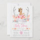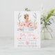 Invitación de baby shower tribal de niñas con hermosos cuernos florales rosados y dorados y una pancarta con una adorable bebé de pelo castaño que lleva un tutú rosa y una corona dorada sobre un fondo de madera rústica. Puede personalizar fácilmente esta hermosa invitación de baby shower tribal boho rústica para su evento simplemente agregando sus detalles. Este es un diseño impreso sin brillo real, etc.