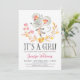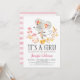 ¡Es una Niña! Monita invitación de baby shower de ratón rosa. Fondo de acuarela y parte posterior a rayas.