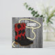 Adorables invitaciones de baby shower de vaquero con botas de vaquero de madera rústica, sombrero de vaquero y espuelas en negro y rojo. Agregue sus datos en la parte delantera y/o trasera simplemente añadiendo los detalles del evento, estilo de fuente, tamaño y color de la fuente, y texto. Tenga en cuenta que todos los diseños de invitaciones que encontrará en Zazzle son gráficos impresos sin joyas, lazos, partes o piezas añadidas, realzadas o grabadas.