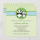 Señal e invitación moderna de la fiesta de bienvenida al bebé. Características mamá y oso de panda del bebé. Paleta de colores verde y azul.