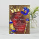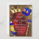 Invitación de baby shower de príncipe real con hermoso azul real y corona dorada y cosas de bebé sobre un bello fondo rojo y dorado. Puedes cambiar el texto según sea necesario para tu evento. Imprime en papel brillante para obtener los mejores resultados.