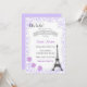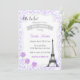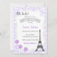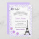 Invitación de la fiesta de bienvenida al bebé con el tema de París y el fondo púrpura.