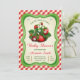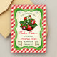 Sorprende a tus invitados con esta linda invitación de baby shower con tema de fresa que presenta hermosas fresas con tipografía moderna sobre un fondo de gingham rojo. Simplemente agrega los detalles de tu evento en esta plantilla fácil de usar para hacer que sea una invitación única. Voltea la tarjeta para revelar un patrón de gingham verde y beige en la parte posterior de la tarjeta.