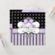 Este Baby Shower Invitation incluye elegantes brazaletes franceses de coprente, puntos de lavanda y taupe en el fondo, una cinta rodada y un hermoso arco lavendar pintado a mano. Todo hecho con obras de arte originales de Audrey Jeanne Roberts. El resultado es un bonito conjunto contemporáneo para bebés. Al revés hay el mismo patrón de puntos y un corchete que revela un lugar para la foto de su bebé. Puede agregar fácilmente su propia imagen o cambiar el mensaje. TAMBIÉN PODRÍAS DISFRUTAR: