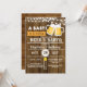 Invitación de baby shower de niño con tema de cerveza y barbacoa y fondo de madera rústica.