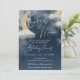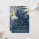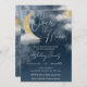Invitación de baby shower dorada y azul marino estamos sobre la luna con estrellas doradas y nubes
