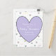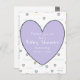 Un Corazón Morado con las palabras, "Por favor únase a nosotros para una fiesta de bebé en honor..." en una tarjeta postal económica estilo Invitación para Baby Shower es simplemente adorable, con pequeños corazones de colores pastel y palabras dulces y cariñosas que traen a la mente los sentimientos especiales detrás del evento. Con accesorios a juego disponibles, este diseño es la selección perfecta para su baby shower. Llame al 203-302-0337 para obtener asistencia para ensamblar el resto de su paquete a juego para baby shower, es decir, decoración para fiestas, tazas, platos, servilletas, papel para regalos y más, vendidos por separado. HAMbWG