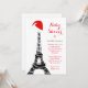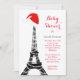 Un sombrero rojo brillante de Santa y luces centelleantes decoran la Torre Eiffel en esta invitación de baby shower invernal inspirada en París, haciéndola perfecta para el baby shower temático francés, parisino, invernal, navideño, festivo, romántico o de María Antonieta.