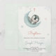 La invitación de bautizo presenta una ilustración linda de un bebé durmiendo en una luna creciente con estrellas pastel. El texto incluye detalles del evento.